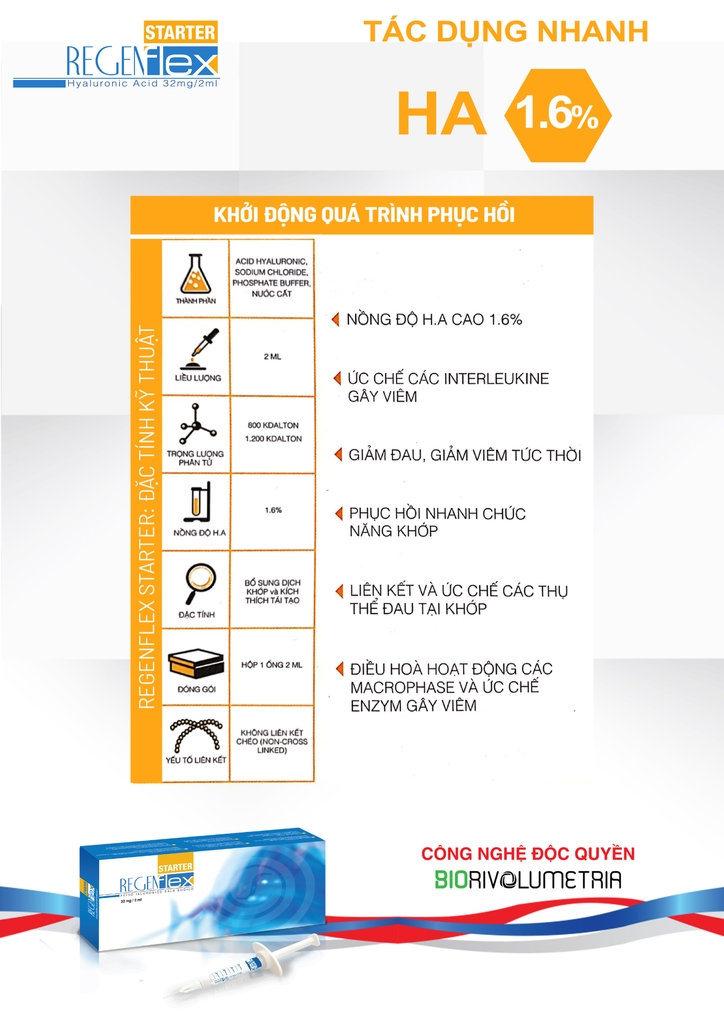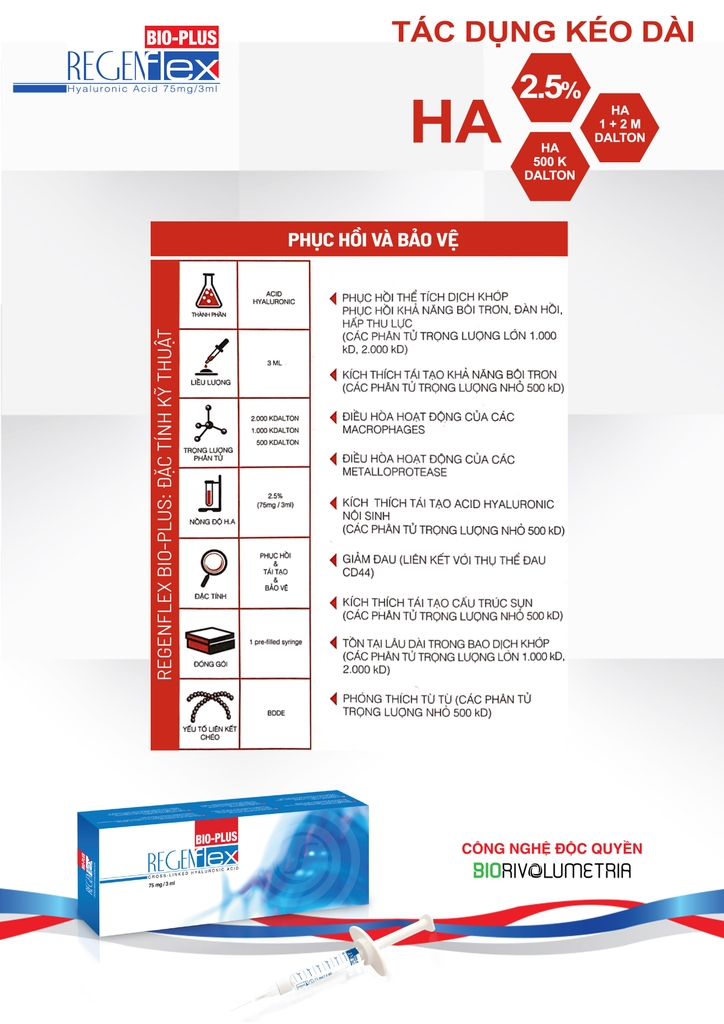 - Tăng cường khả năng tái tạo dịch khớp tự nhiên nhờ các hạt tự do (Hyaluronic Acid 500 kDalton) số lượng lớn và duy trì lâu dài ổn định.